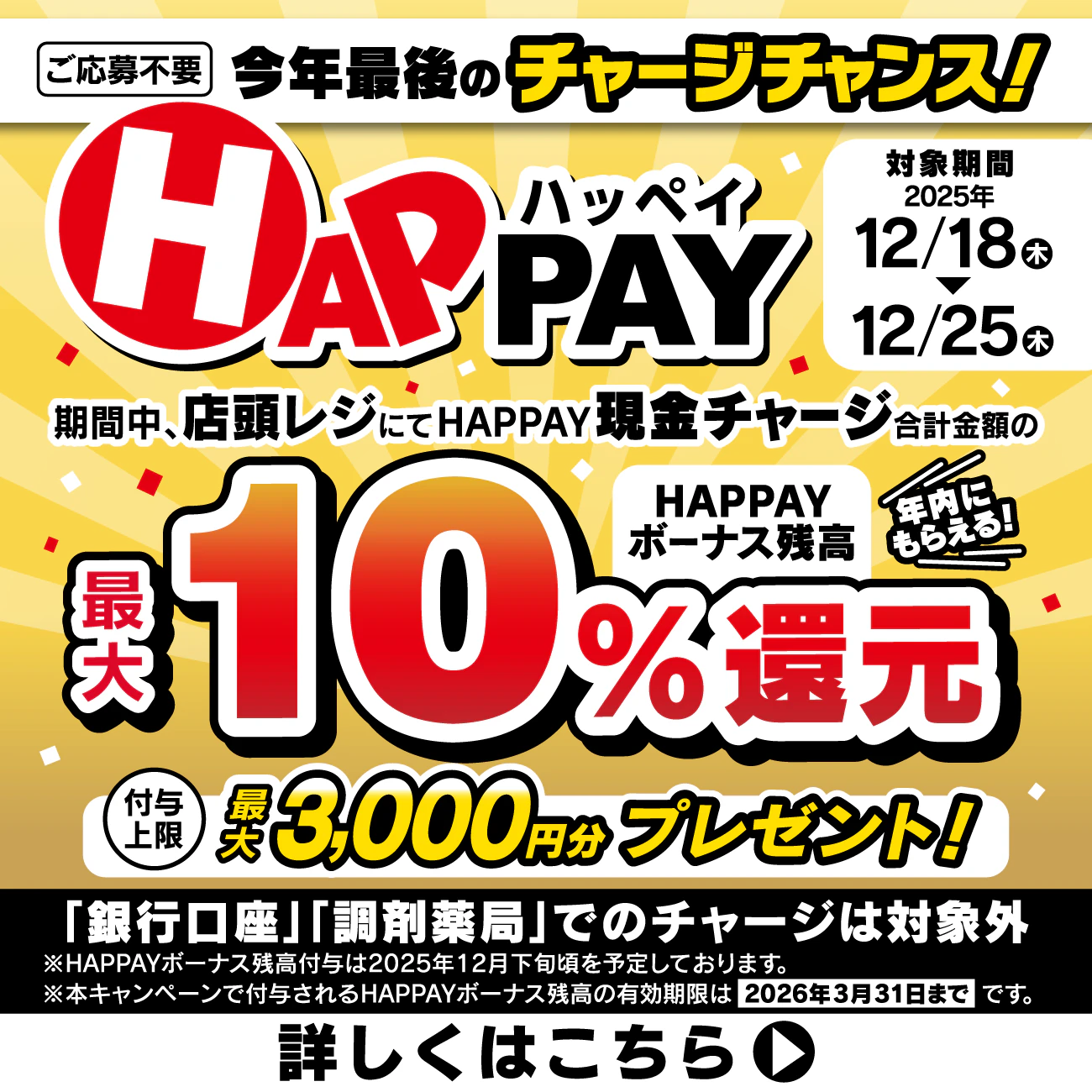 2025/12/18~12/25 \今年最後のHAPPAYチャージチャンス!/最大3,000円分のHAPPAYボーナスがもらえる!!