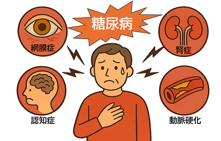 高血糖を放置して全身の血管が障害されると、網膜症、腎症、動脈硬化といった合併症のリスクが高まるほか、心筋梗塞、脳梗塞になる確率も高まることが知られています。